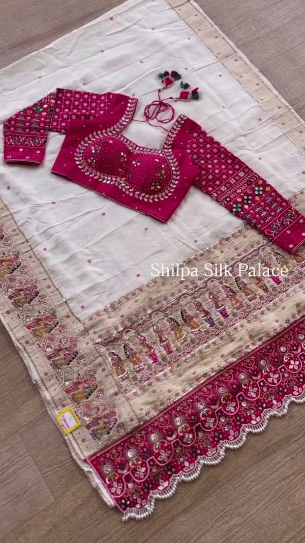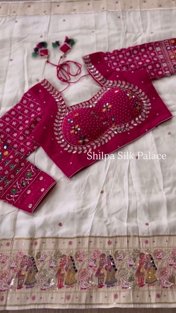 The saree would feature delicate hand-embroidered designs. This could include traditional motifs such as florals, paisleys, or geometric patterns. The embroidery is often done with threads like zari (gold or silver), beads, sequins, or even stones, adding a touch of sparkle. - Color and Design: